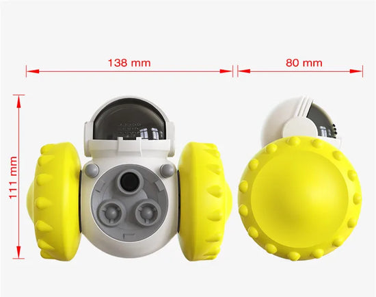 TREAT DISPENSING DOG PUZZLE TOY - Designed with cute robot shape and fun treat dispensing roller, the interactive chase toy combines puzzle toy with food treat dispensing function. It catches your pet’s attention and encourages them to push it in order to get food rewards.